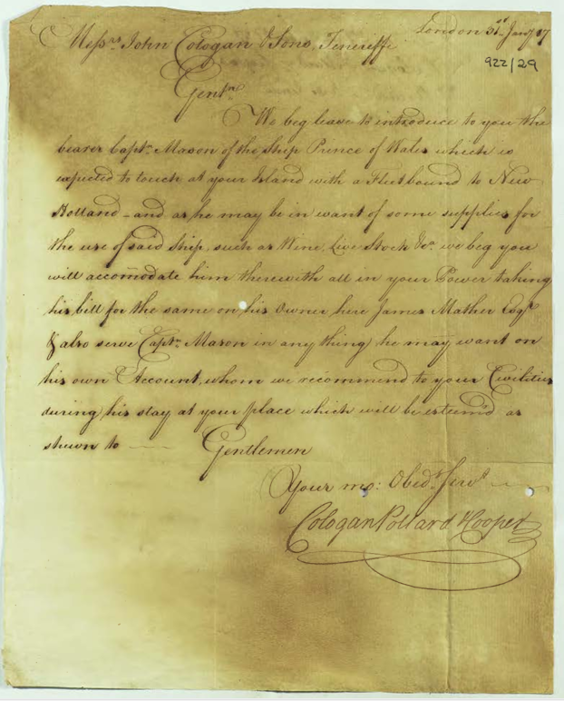 The only other commercial documents known to exist are two letters of credit used at Tenerife for the purchase of fresh provisions and wine. They were both issued by the London partnership of Cologan, Pollard & Cooper, addressed to the related firm of John Cologan & Sons at Tenerife, in favour of John Mason, the captain of the Prince of Wales, and John Watts, a naval lieutenant on leave who had sailed out on the Lady Penrhyn as a supernumerary.
