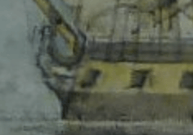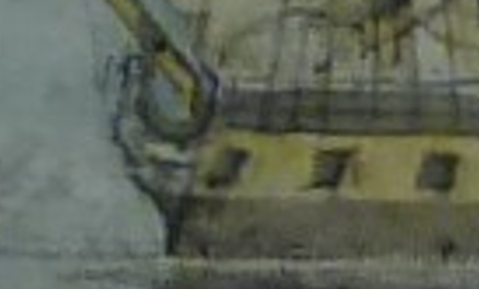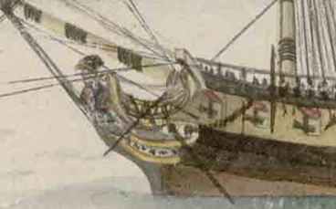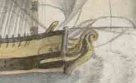 Detail of George Raper’s watercolour of the Supply showing her fiddlehead scroll [3].