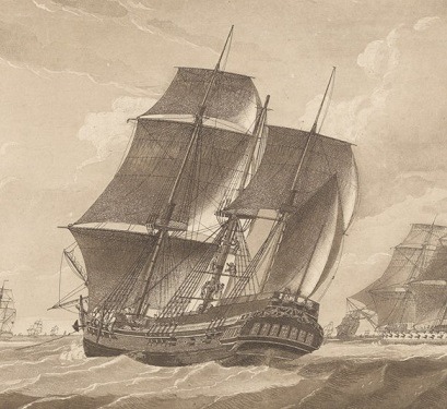 ('The Lady Juliana in tow of the Pallas Frigate, The Sailors Fishing the Main Mast which was Shatterd by Lightning', aquatint by John Harris after Robert Dodd, n.d., c. 1800, UK National Maritime Museum, PAH 8432)